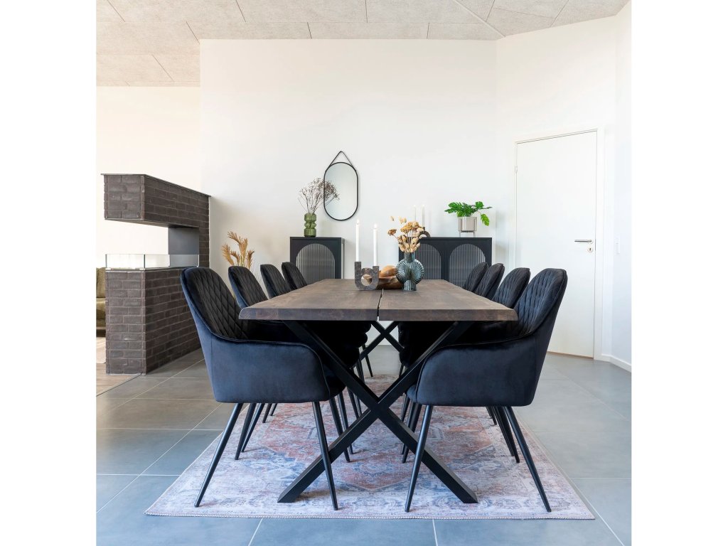 Každá jídelna potřebuje krásný dřevěný stůl z masivu. Jídelní stůl TOULON HOUSE NORDIC, tmavý dub o rozměrech 240x95x75 cm v kombinaci s podnoží z robustního černého kovu toto splňuje na 100%. Masivní deska je ošetřena kouřovým olejem a hrany desky jsou opracovány do skosení a lehkého zvlnění.