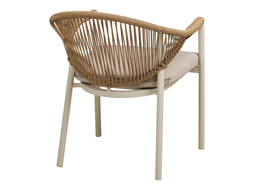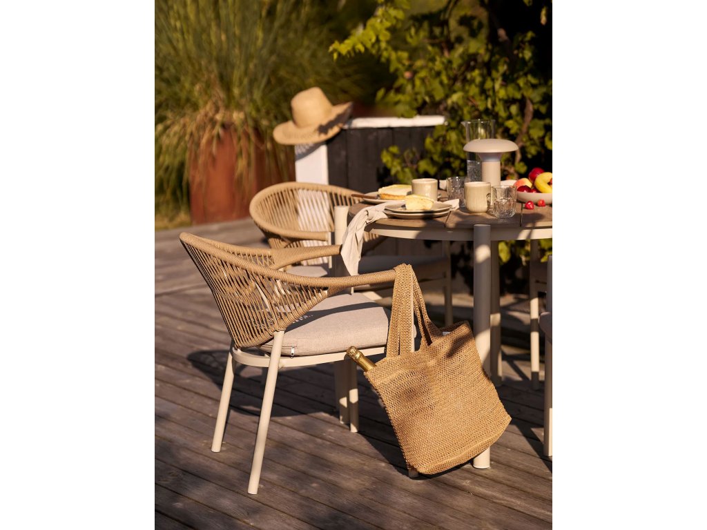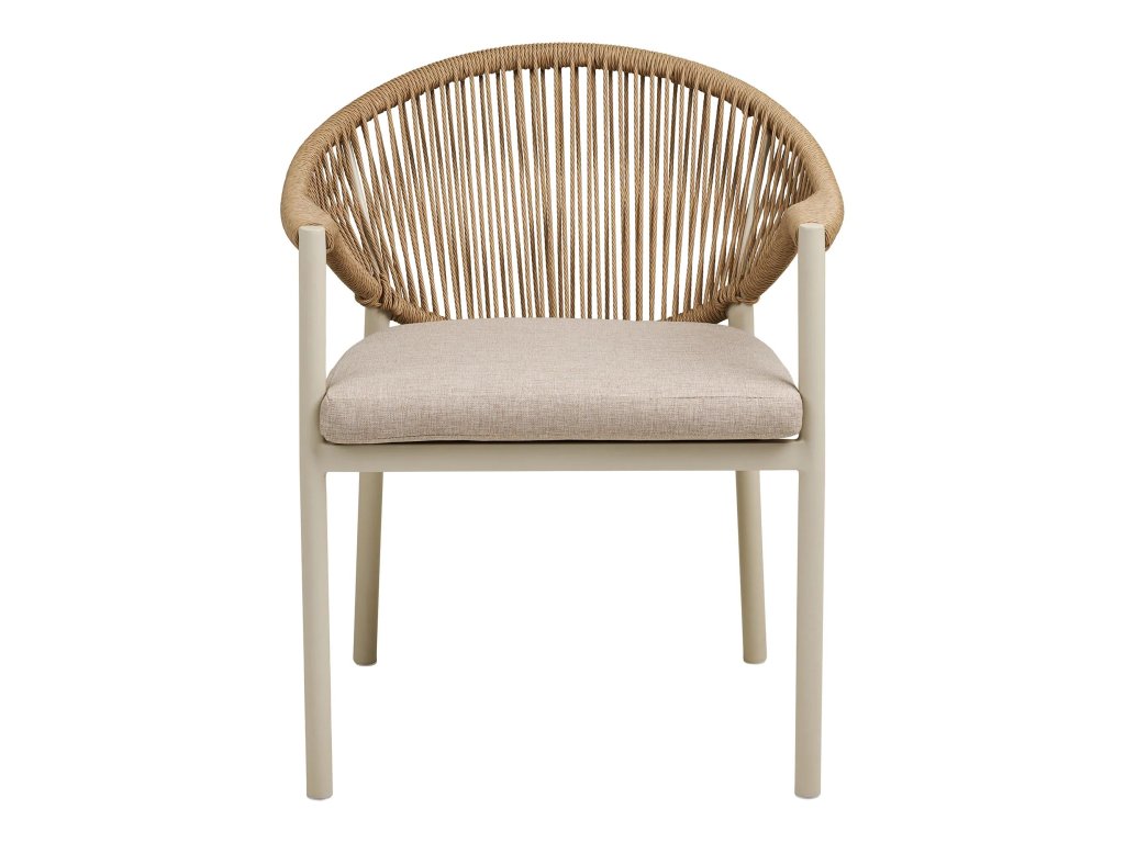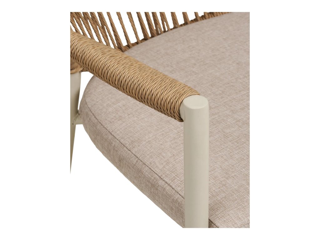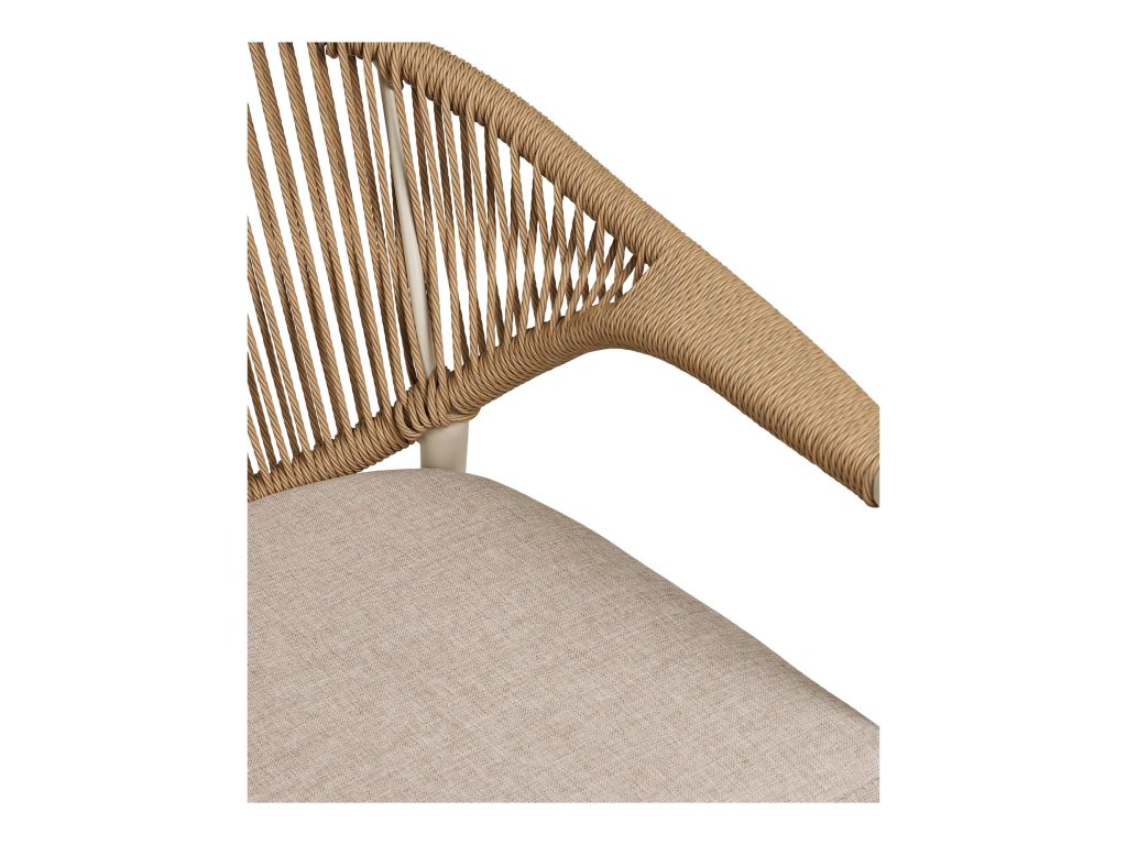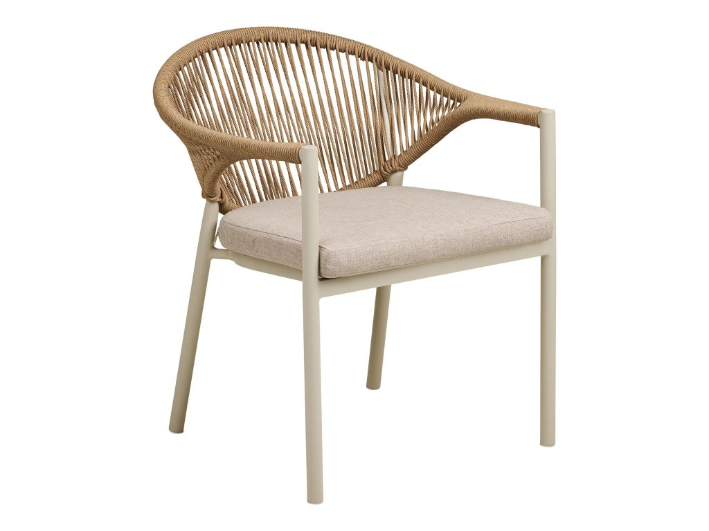 Jídelní židle ABELA je vyrobena z kovového rámu, polyesterového podsedáku a výpletu z polyratanu na opěradle a područkách. Židli ABELA uplatníte v exteriéru k jakémukoli zahradnímu stolu, ale nejlepší kombinace je s kulatým či obdélníkovým stolem ABELA. Součástí židle ABELA je zobrazený podsedák v pískové barvě.