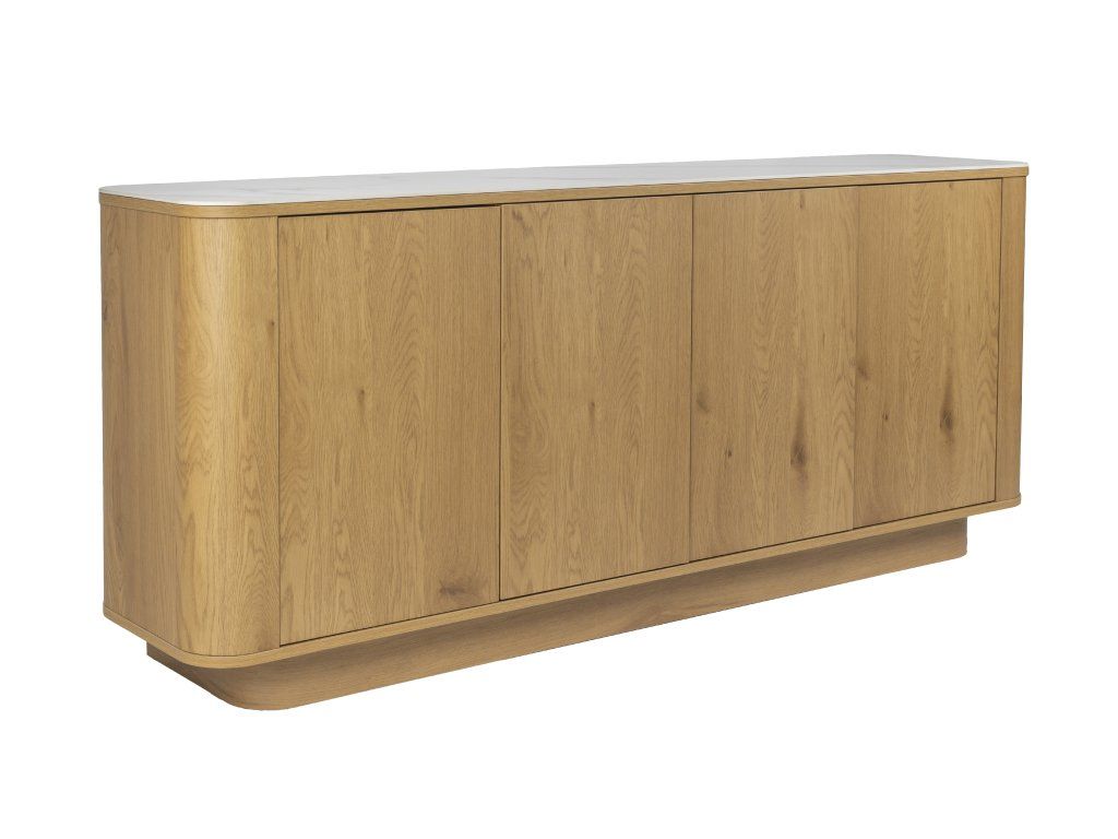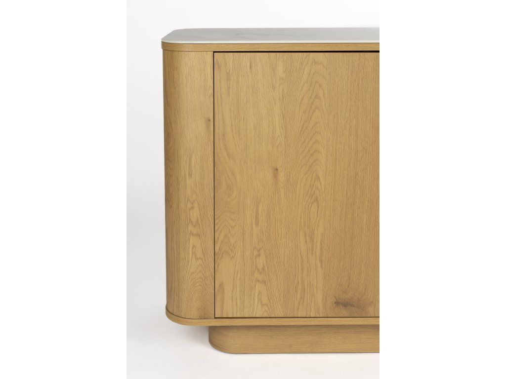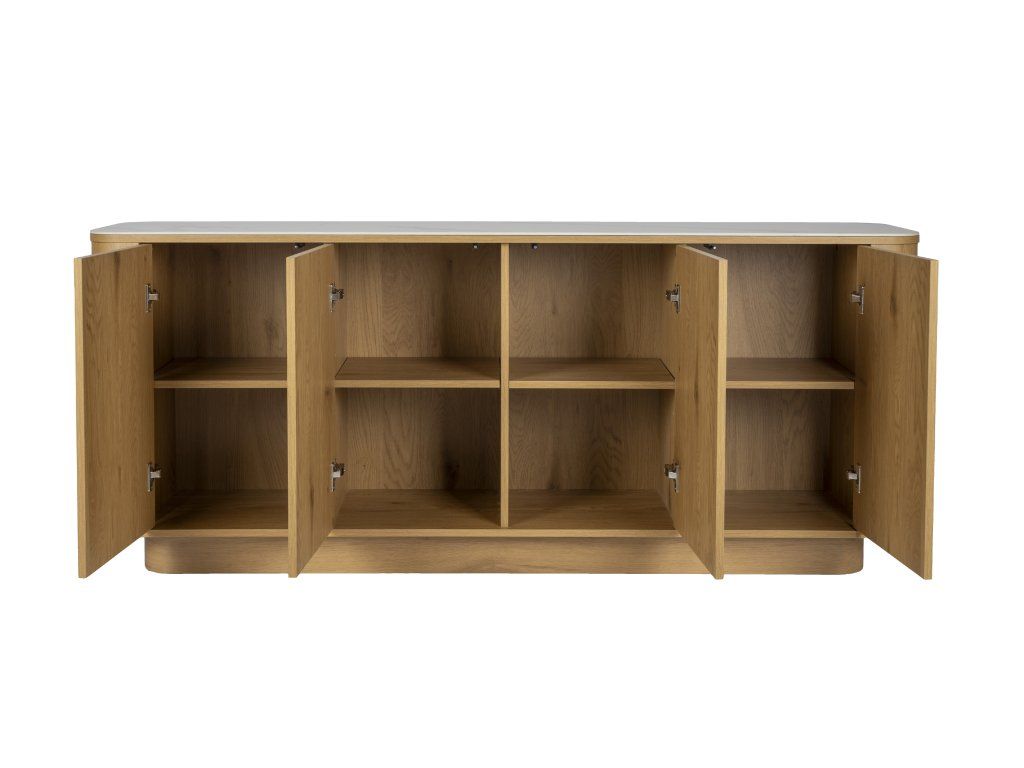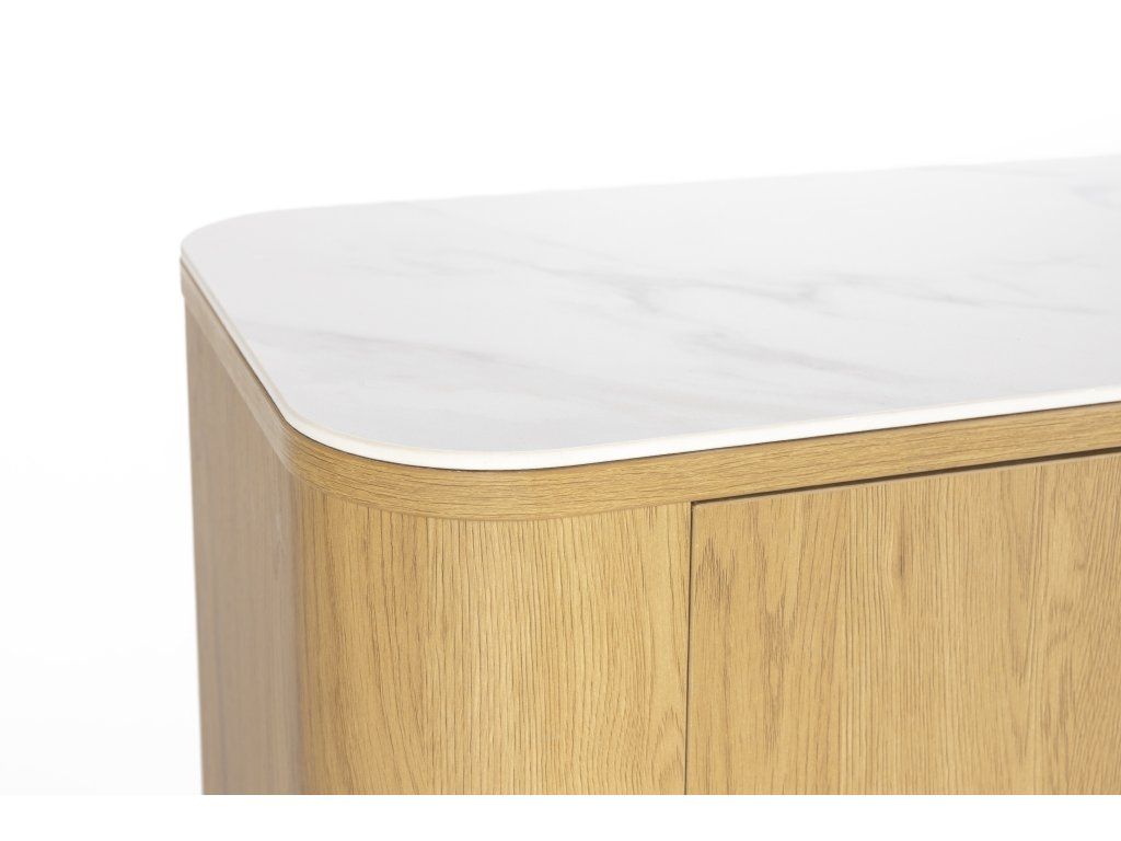 Vysoká komoda ALMIRA je působivý kus - komoda se čtyřmi dvířky, které zakrývají osm přihrádek a s jedinečným kontrastem mezi deskou ve vzhledu mramoru a přírodní spodní částí. Komoda ALMIRA unese celkem 80 kg nádobí, prádla nebo jiných věcí. Kombinace materiálů a tvarů v jedinečném designu činí z tohoto příborníku opravdový skvost v každém interiéru.