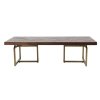 Konferenční stůl Class je vyroben z MDF desky s akáciovou dýhou a doplňují ho kovové prvky čtvercového tvaru v barvě antická mosaz.