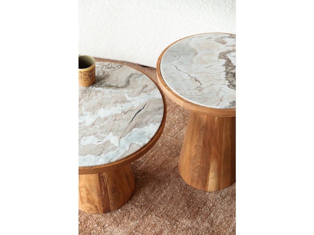 Odkládací a konferenční stolky MEES okamžitě dodají vašemu interiéru atmosféru. Skvěle se hodí k použití společně i samostatně. Kulatá podnož je vyrobena z akáciového dřeva a zužuje se odspodu nahoru. To zajišťuje, že stolky stojí pevně. Do horní plochy stolu je zasazena kulatá mramorová deska. Světlá barva desky stolu vytváří výrazný kontrast se dřevem. To dodává nábytku teplý a přírodní vzhled.