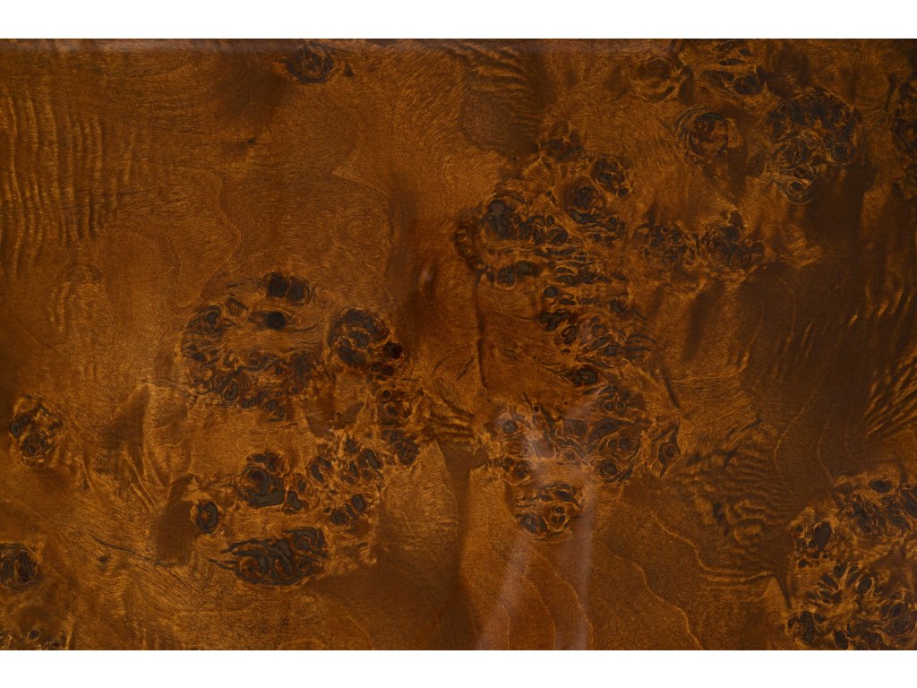 Vyrobeno s deskou z burlu (stromový výrůstek s nepravidelným tvarem a výraznou kresbou dřeva, který vzniká v důsledku stresu nebo poškození stromu. Může to být kulovitý výrůstek na kmeni nebo větvi, často s mnoha malými pupeny. Burl se využívá v truhlářství pro jeho estetickou hodnotu) nebo ořechového dřeva
