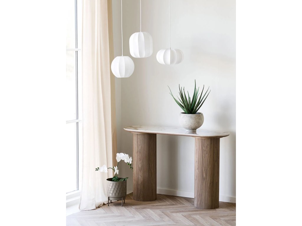 Konzolový stolek ATHENS o rozměru horní desky 120x40 cm, výška stolku 78 cm, v provedení základny z MDF s dekoračním papírem, s horní bílou deskou z keramiky je novinkou dánské firmy House Nordic. Stolek ATHENS lze objednat také v dalších provedeních (jako jídelní, odkládací, konferenční), takže v jednom stylu můžete zařídit jídelnu i obývák.