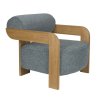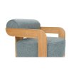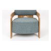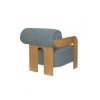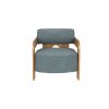 Křeslo OOLONG v modrém bouclé čalounění, s dubovou základnou se zaoblenými rohy, výrobek holandské firmy Zuiver