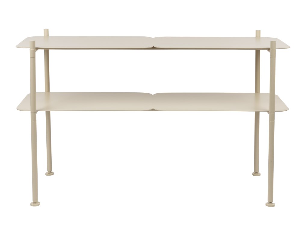 Policový regál RIVER L v béžové barvě má rozměry 100x35x62 cm. Konstrukce i dvě police jsou kovové v béžové barvě.
