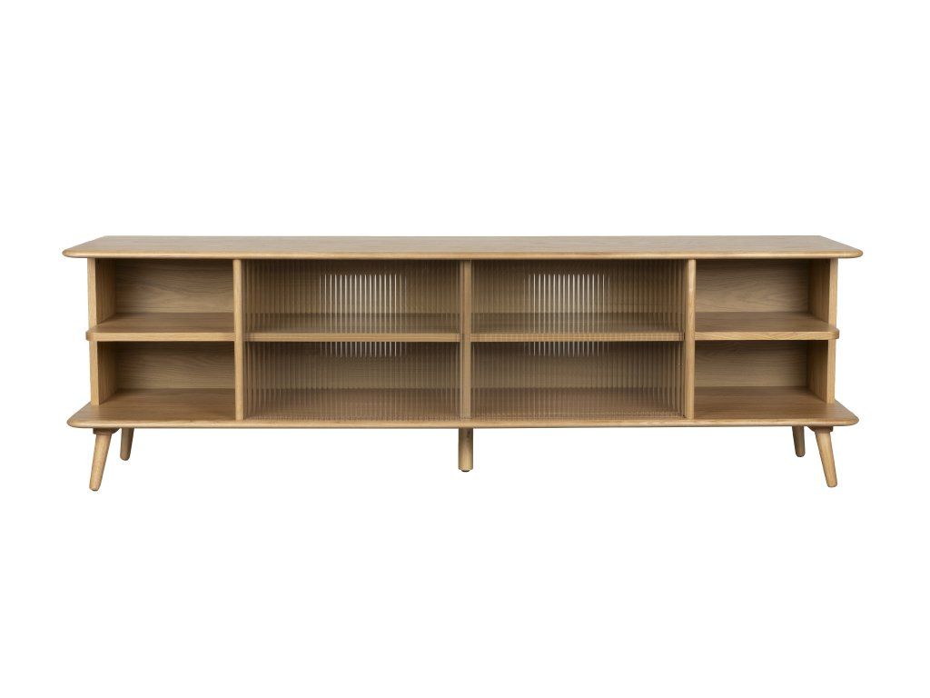 Široká komoda RISE, jasanové dřevo, světle hnědá je velmi užitečným kusem nábytku, protože do jejích osmi sektorů uschováte drobné kusy oblečení stejně dobře jako suvenýry z cest nebo další předměty. Máte na výběr volně přístupné prostory nebo prostor za žebrovaným sklem.