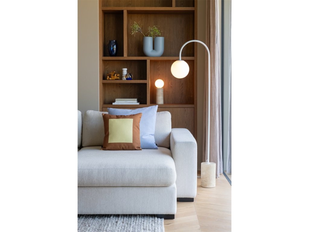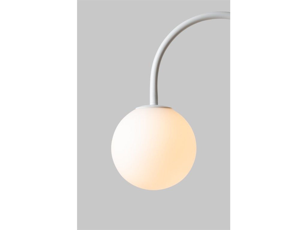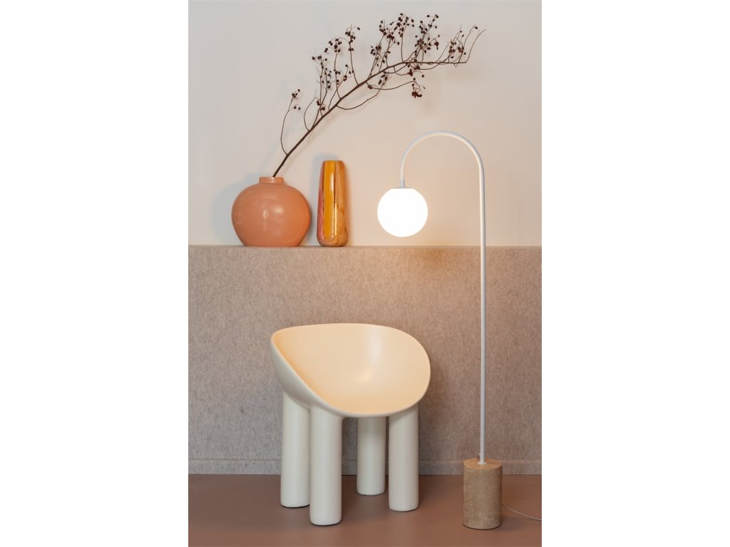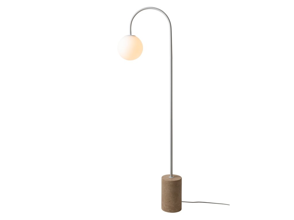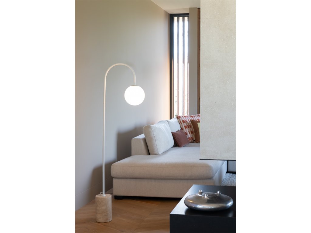 Stojací lampa TIVOLI v barvě bílé je svítidlo vyrobené z kovu, s celkovou výškou 163 cm, s válcovou mramorovou základnou, s černobílým kabelem. Lampě vévodí bílé skleněné svítidlo.