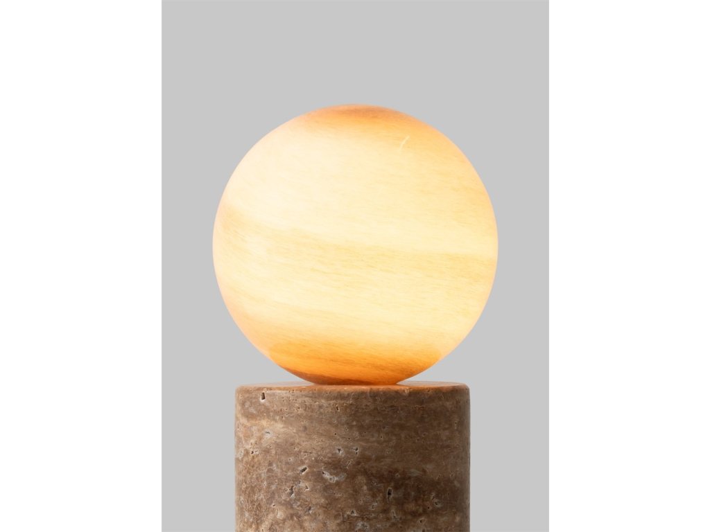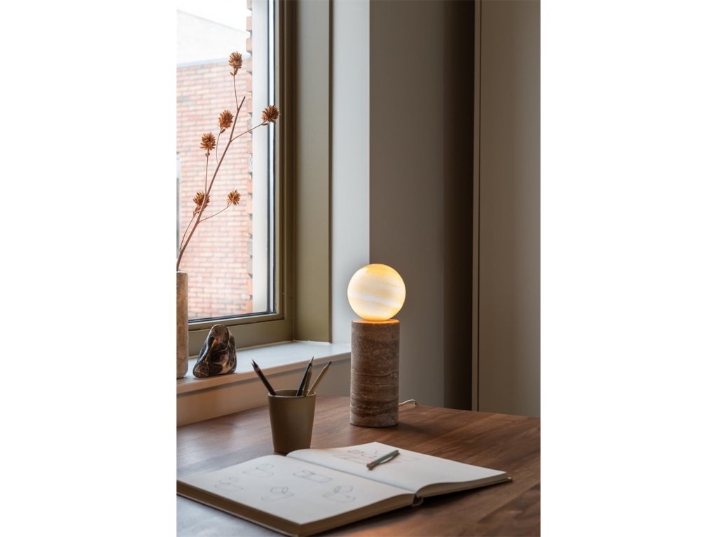 Stolní lampa TIVOLI v barvě pískové je svítidlo vyrobené z mramoru, s celkovou výškou 33 cm, se světle hnědým kabelem. Lampě vévodí skleněné stínidlo.