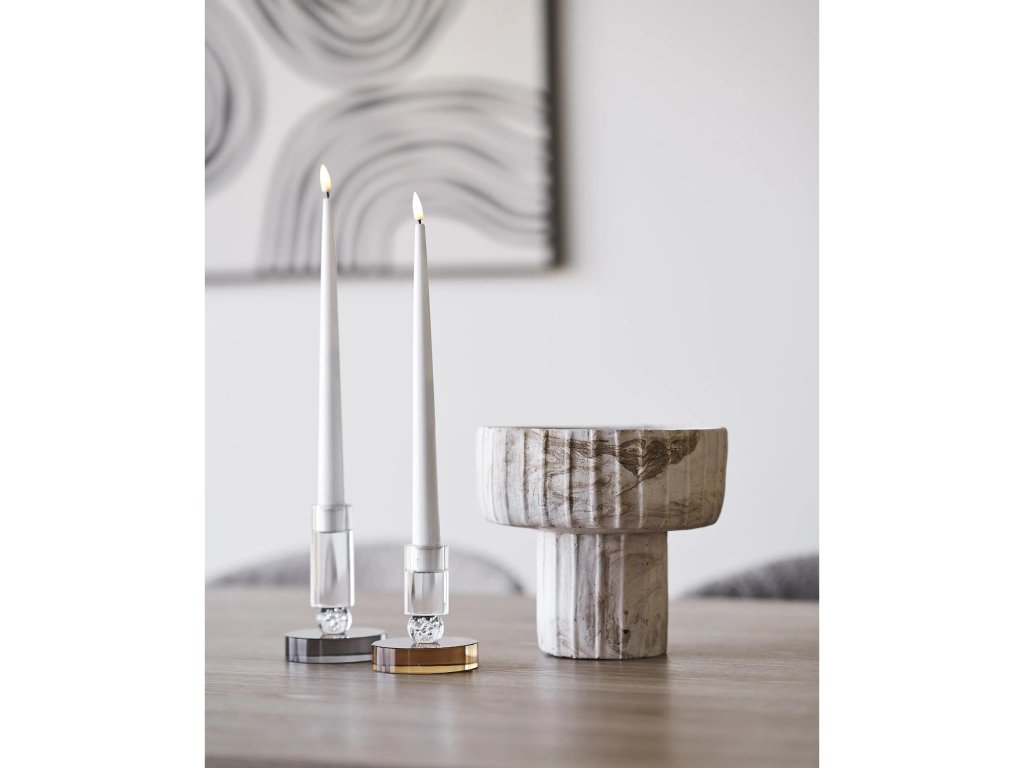 Svícen HOLDER - sklo, ø8,5x10 cm, barva bílá a hnědá od dánské firmy HOUSE NORDIC je vyroben z ručně foukaného skla a je připraven na sloupovou svíčku. Rozměr svícnu je Ø8x7,5 cm. Svícen je novinkou podzimu 2025, užijete ho pro dekoraci do obývacího pokoje nebo do ložnice (nezapomeňte před spaním sfouknout svíčku). Spojení čistých linií, skla a přírodních tónů nikdy nevyjde z módy. Elegantní skleněné svícny dodají vašemu interiéru lehkost, styl a nadčasovost.