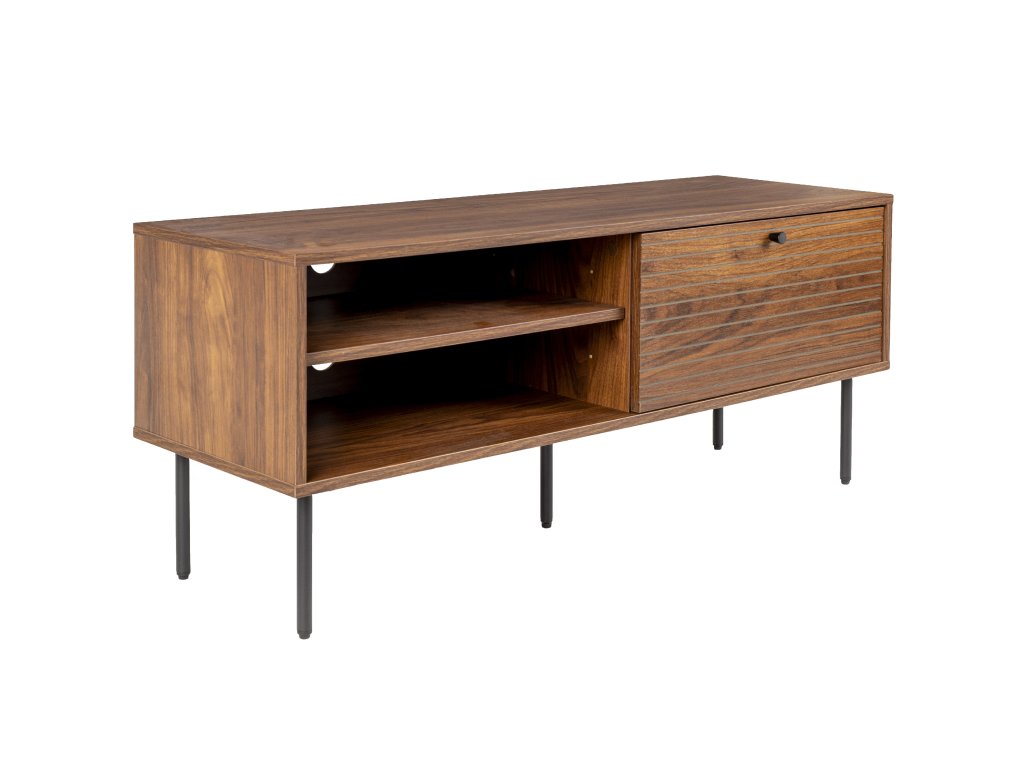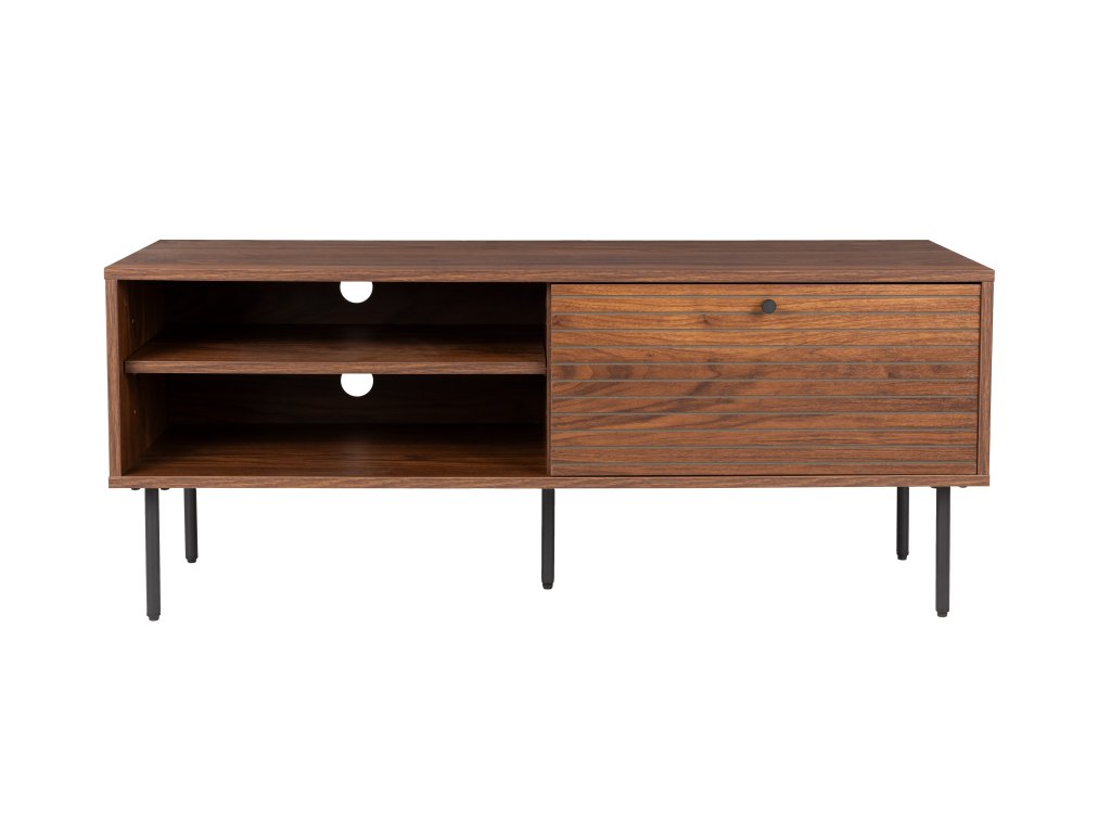 TV komoda STRIPES 120x40cm, dvě police a uzavřený prostor, dřevo a kov, hnědá je skvělým nábytkem pro audio hi-fi a dalších elektrospotřebičů, které nechcete mít volně vystavené. TV komoda STRIPES se stane stylovou a praktickou součástí vašeho obývacího pokoje nebo kanceláře. K uložení spotřebičů vám poskytne dva prostory oddělené policemi, v pravé části je prostor uzavřen za dřevěnými dvířky. TV-komoda STRIPES přichází od holandské firmy White Label Living (WLL).