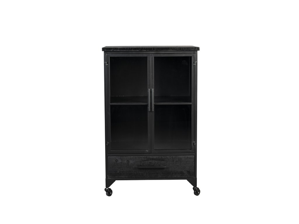 Moderní vitrína FERRE WLL 105x65 cm dřeva a kov, černá na kovových kolečkách je skvělým nábytkem pro úložný prostor vašich knih,nádobí,skleniček nebo dekorací.Vitrína FERRE se stane stylovým a praktickým bytovým nábytkem vašeho obývacího pokoje, kuchyně nebo kanceláře. K uchování vašich věcí vám poskytne 1 police ukrytá za 2 skleněnými dvířky a 1 prostorná zasouvací zásuvka (šuplík).Dlouhá životnost je zaručená precizním dílenským zpracováním od holandského dodavatele White Label Living.