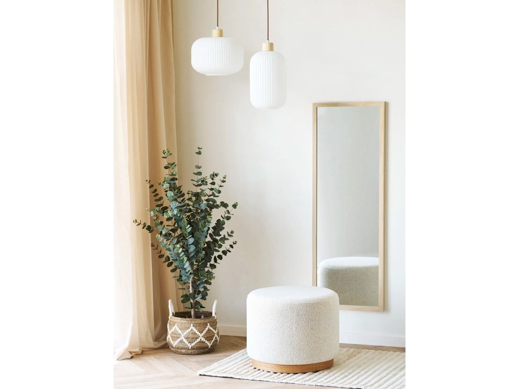 Montura je dřevěná, svítidlo je v kombinací bílého skla a dřeva v přírodní barvě, textilní přívodní kabel je v délce 120 cm a je v hnědé barvě.