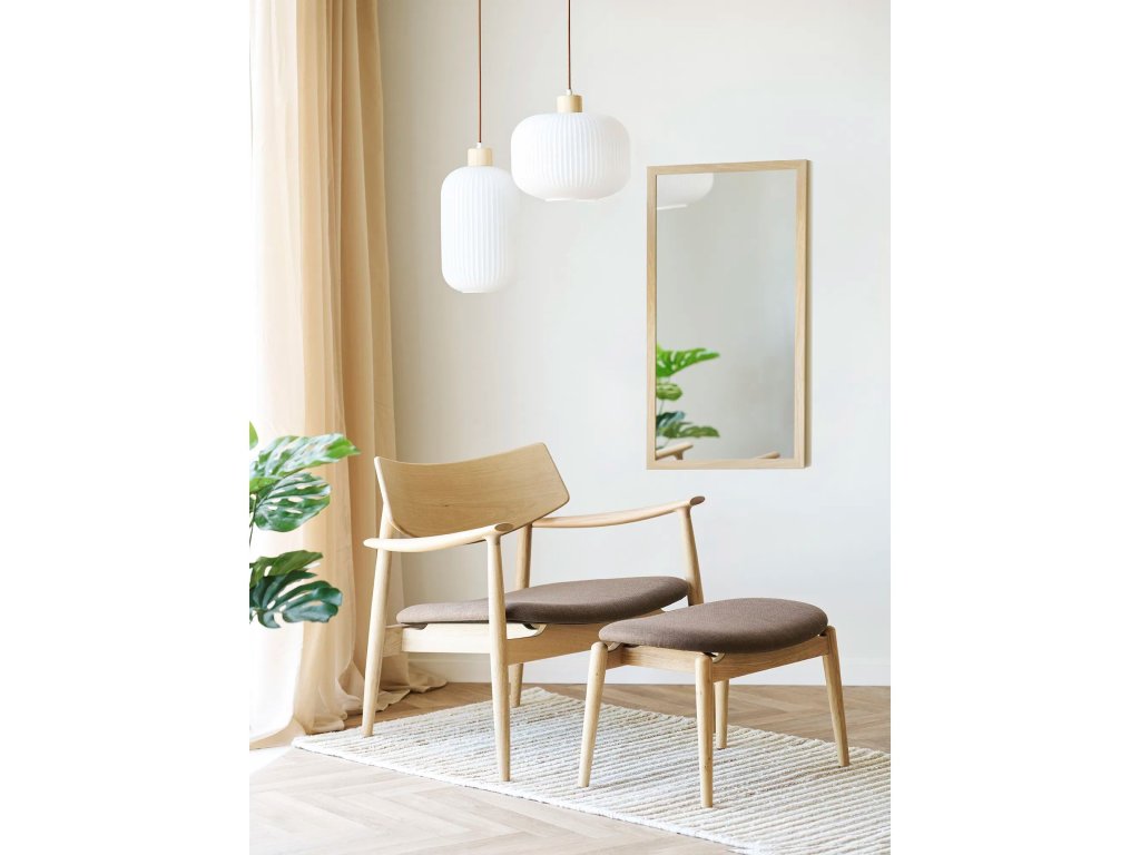 Montura je dřevěná, svítidlo je v kombinací bílého skla a dřeva v přírodní barvě, textilní přívodní kabel je v délce 120 cm a je v hnědé barvě.