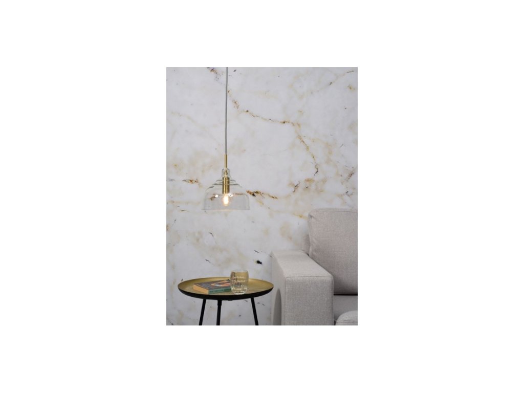 Závěsná lampa BRUSSELS kulatá z transparentního skla a kovu ve zlaté barvě